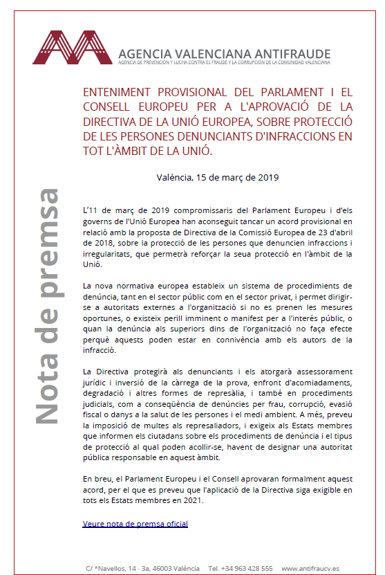 El 27 de gener de 2021 va finalitzar el termini de consulta pública obert pel Ministeri de Justícia del Govern d’Espanya perquè qualsevol persona, entitat, associació o organisme públic poguera presentar al·legacions a la transposició de la Directiva Europea 2019/1937 relativa a la protecció de les persones que informen sobre infraccions del Dret de la Unió, coneguda com a Directiva Whitleblowers.