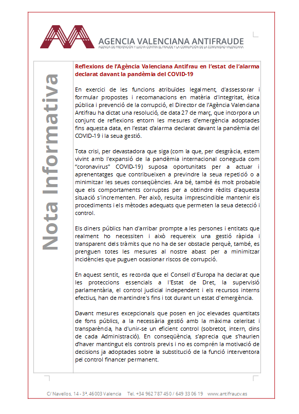 L’Agència Valenciana Antifrau publica totes les seues resolucions finals d’investigació en la seua pàgina web