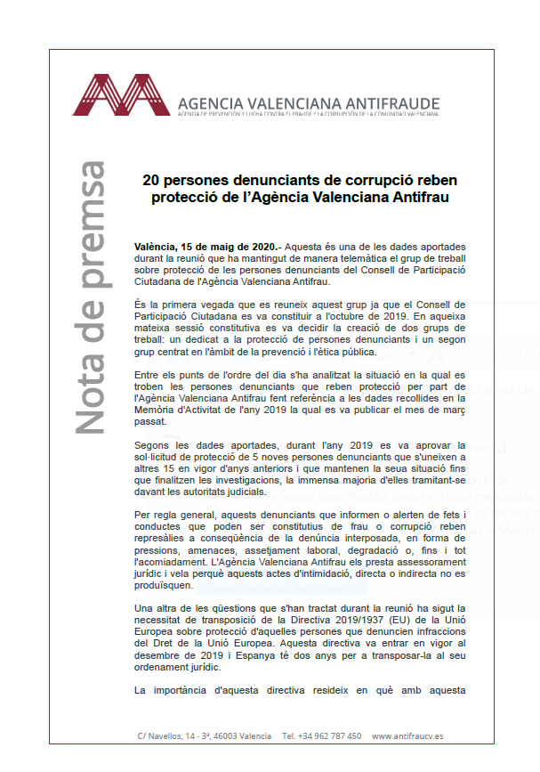 L’Agència Valenciana Antifrau aprova la primera resolució per la qual s’aplica l’Estatut del Denunciant