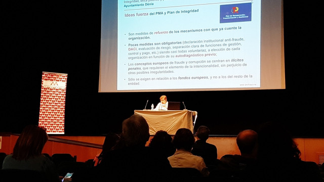 Su intervención finalizó recordando que la misión de servicio público de cualquier entidad pública es la consecución del interés general, debiendo proteger todo tipo de fondos públicos de cualquier clase de irregularidad, y no limitarse a proteger sólo los fondos procedentes de la UE de irregularidades eminentemente penales, articulando marcos preventivos como contenido de su propio plan de integridad y/o plan de medidas antifraude. Por ello, señaló, la Agencia aprobó La Guía AVAF: El Plan de Integridad Pública: Hoja de Ruta y Anexos Facilitadores que, junto con otros materiales, pude consultarse en su página web.