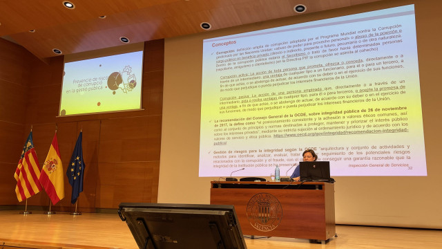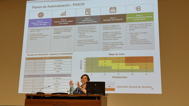 Delia Cuenca Antolín, inspectora de servicios de la Inspección General de Servicios de la Generalitat Valenciana (IGS-GVA), fue la primera de las ponentes de la sesión y centró su exposición en la metodología de la IGS-GVA para la realización de mapas de riesgos y autoevaluación de riesgos en materia de contratación pública.