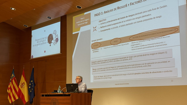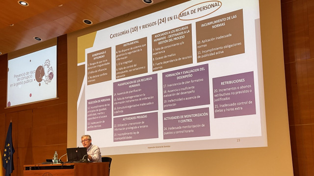 José Luis Gaona, inspector de servicios en la IGS-GVA, detalló en la jornada la metodología utilizada por la Inspección General de Servicios, en relación a la gestión de personal y puso el foco en los riesgos existentes en la materia, como son, entre otros, la ausencia de planificación, no detectar actividades privadas, o los sistemas de retribuciones singulares.
