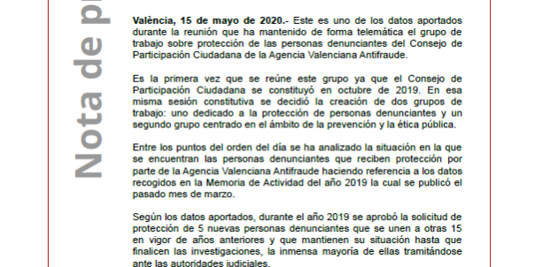 Valencia, May 15, 2020.– This is one of the data provided during the meeting held electronically by the working group on the protection of complainants of the Citizen Participation Council of the Valencian Anti-Fraud Agency.
