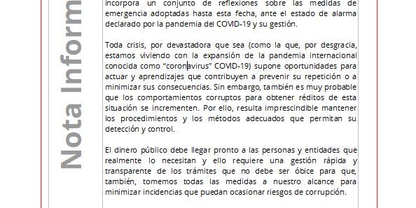 Every crisis, no matter how devastating it may be (such as the one that, unfortunately, we are experiencing with the expansion of the international pandemic known as COVID-19 “coronavirus”) provides opportunities for action and learning that help prevent its recurrence or minimize its consequences. However, it is also very likely that corrupt behaviors to obtain profits from this situation will increase. Therefore, it is essential to maintain the appropriate procedures and methods that allow its detection and control.