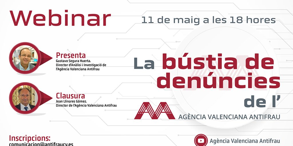 València. 14 de mayo de 2021. La Agencia Valenciana Antifraude celebró el pasado 11 de mayo un nuevo webinar dedicado a explicar a la sociedad civil y los empleados públicos el funcionamiento del Buzón de Denuncias. De la mano de Gustavo Segura, Director de Análisis e Investigación de la AVAF, los participantes inscritos y lo seguidores del canal de youtube de la agencia conocieron su funcionamiento, utilidades y ejemplos prácticos. En su intervención, Segura hizo hincapié en el crecimiento de denuncias recibidas por la AVAF por este canal de comunicación, que a día de hoy, supone el 85% de las denuncias recibidas. Otro aspecto importante fue el énfasis que pone la Agencia Valenciana Antifraude en la protección del denunciante y el anonimato de las personas que denuncian. Para finalizar el webinar, tras las preguntas formuladas por los participantes, tanto de la reunión por Webex, como de los seguidores de la emisión en directo por youtube, Joan Llinares, Director de la AVAF, aprovechó para agradecer la asistencia a esta nueva jornada formativa. El director señaló también que este tipo de iniciativas se enmarcan dentro de la estrategia de la Agencia Valenciana Antifraude para acercar la institución a la ciudadanía y profundizar en el conocimiento de las herramientas que están a disposición de la sociedad para prevenir e investigar el fraude y la corrupción.