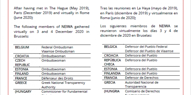 València, 16 de diciembre 2020.- La Red Europea de Autoridades de Integridad y Alertadores (NEIWA) ha aprobado la Declaración de Bruselas tras las reuniones mantenidas de forma telemática los días 3 y 4 de diciembre, las cuales deberían haberse celebrado en esta ciudad europea como estaba previsto pero ello ha sido imposible por la situación de pandemia.