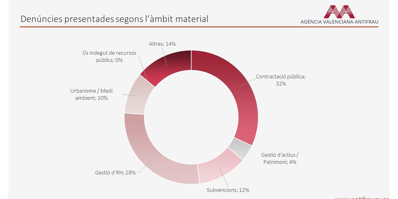 València, 25 de maig de 2021.- L’any 2020 es van presentar en l’Agència Valenciana Antifrau un total de 226 denúncies, un 34% més que durant l’any 2019. Respecte a la matèria objecte de denúncia 72 de les 226 denúncies presentades, és a dir, el 32%, feien referència a la contractació pública.