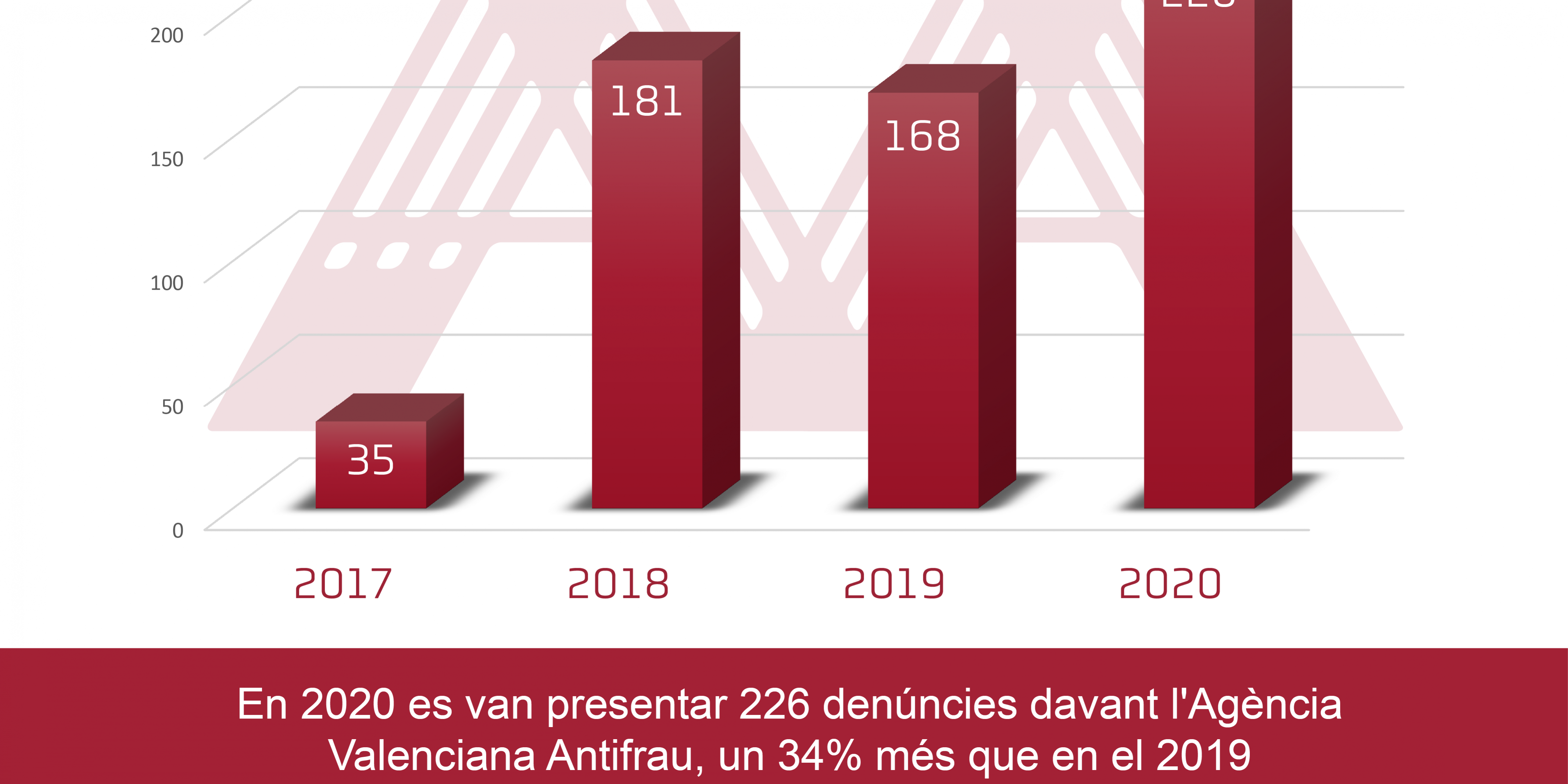 Entre les primeres dades que s’han extret de l’anàlisi treballe realitzat estan els corresponents al nombre de denúncies presentades davant l’AVAF que durant l’any 2020 ha aconseguit la xifra de 226. L’any 2019 es van presentar 168 denúncies pel durant el 2020 s’ha incrementat en un 34% el nombre de denúncies presentades malgrat la complicada situació registrada per la crisi de la COVID-19.