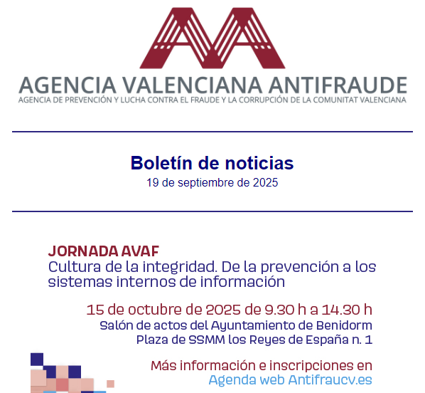 Newsletter de l’AVAF Tota l’actualitat de l’Agència Valenciana Antifrau, de manera senzilla cada quinze dies, en el teu correu electrònic. Subscriu-te! * campos obligatoris Correu electrònic * Nom Cognoms Últim Butlletí de notícies19 de setembre de 2025