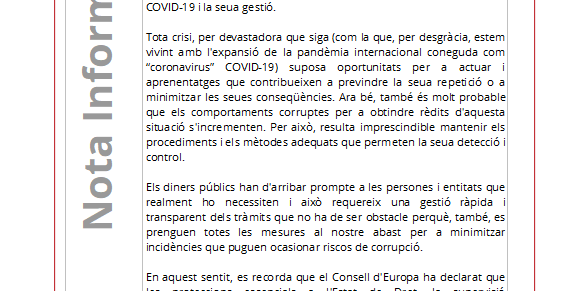 Tota crisi, per devastadora que siga (com la que, per desgràcia, estem vivint amb l’expansió de la pandèmia internacional coneguda com “coronavirus” COVID-19) suposa oportunitats per a actuar i aprenentatges que contribueixen a previndre la seua repetició o a minimitzar les seues conseqüències. Ara bé, també és molt probable que els comportaments corruptes per a obtindre rèdits d’aquesta situació s’incrementen. Per això, resulta imprescindible mantenir els procediments i els mètodes adequats que permeten la seua detecció i control.