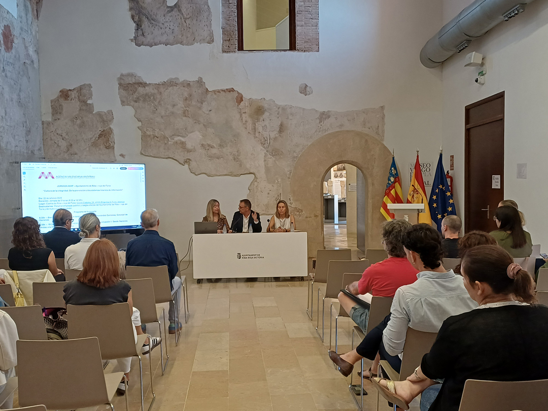 Riba-roja de Túria, 22 d’octubre de 2025.– “Cultura de la integritat. De la prevenció als sistemes interns d’informació” va ser la jornada organitzada per l’Agència Valenciana Antifrau (AVAF) que va reunir personal empleat públic de diverses àrees municipals de l’Ajuntament de Riba-roja de Túria.