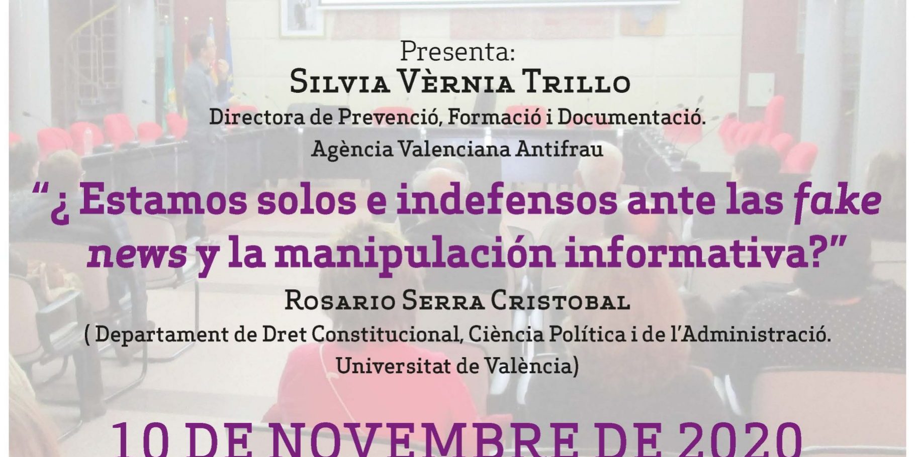 Nov92020Agenda-Va “Estem sols i indefensos davant les fake news i la manipulació Informativa?”; Sra. Rosario SERRA CRISTÓBAL; Catedràtica de Dret Constitucional en la UV; Auditori Municipal (el Mercat). Plaça de la Verge, 16. Category: Agenda-VaBy 9 de November de 2020 Author: Post navigationPreviousPrevious post:Reunió del Consell de ParticipacióNextNext post:L’Agència Valenciana Antifrau publica una recomanació sobre la necessitat de planificació per a previndre la corrupció en les administracions públiquesRelated PostsSeminari Web Què passarà el 17 de desembre?10/06/21Unisocietat a Paterna. Conferència presentada y patrocinada per l’AVAF12/04/21Unisocietat a Quart de Poblet. Conferència presentada i patrocinada per l’AVAF12/04/21Unisocietat a Alzira. Conferència presentada i patrocinada per l’AVAF12/04/21Universitat Estacional a Xàtiva. Conferència presentada i patrocinada per l’AVAF12/04/21Docufòrum12/04/21